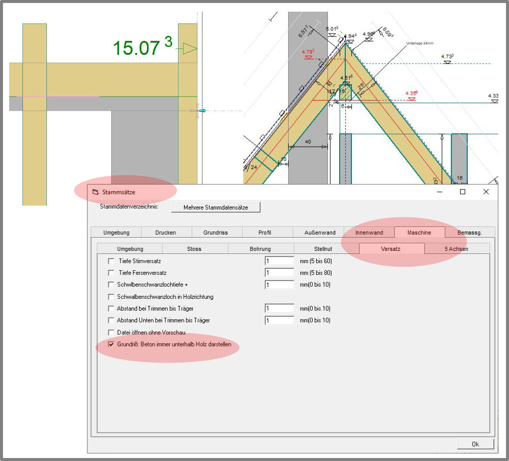 Fehlerbehebung: Beim trimmen von Dachflächen wurden die Sparren im Grundriss nicht korrekt angezeigt.Neu: Koppelpfettenrisse werden bei der Maschinenübergabe automatisch auf den Bindern markiert