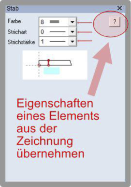 AlphaSchiftUpdate 850 1S1. Die Eigenschaften von bestehenden Linien, Stäben oder Rechtecken lassen sich über den Schalter [?] abrufen um mit der gleichen Eigenschaft neue Element zu zeichnen