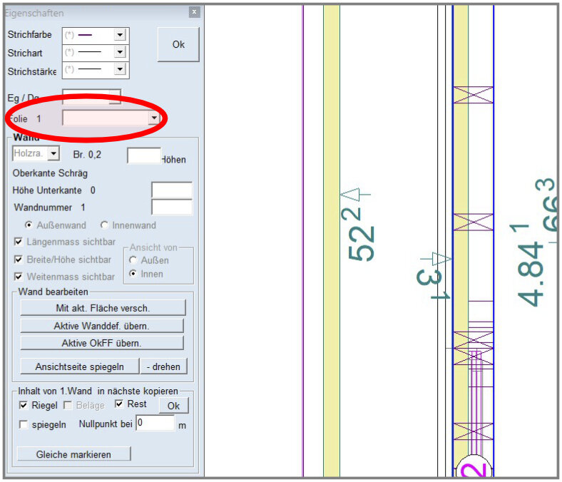 - Die Folieneinstellung in den Wänden kann für alle Wände des Bauvorhabens gespeichert werden.